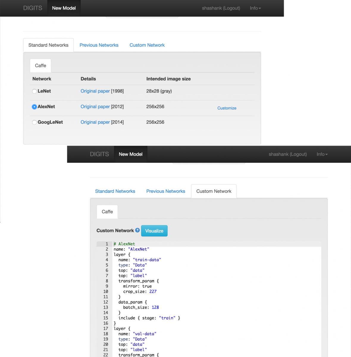 Choose predefined LeNet, AlexNet, GoogLeNet or provide custom networks