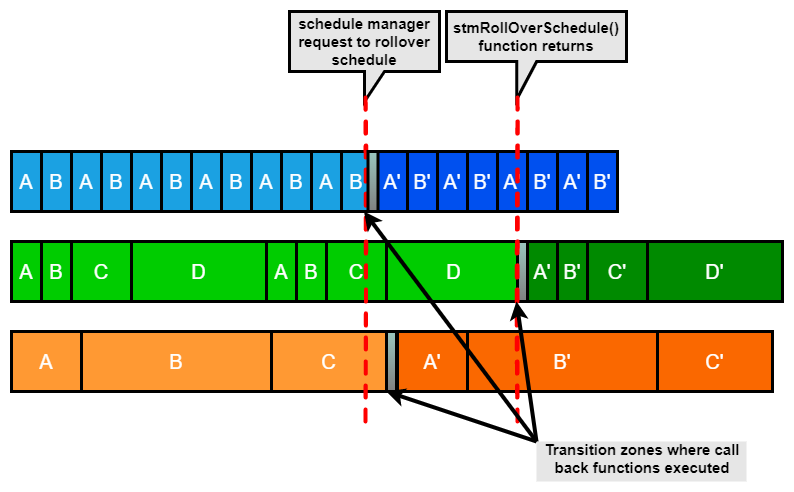 STM implements a rollover schedule switch as depicted in the figure below. Upon receiving a request to rollover from schedule A to B, each hyperepoch in schedule A finishes executing its current frame. As soon as a hyperepoch in schedule A finishes its current frame, the corresponding hyperepoch in schedule B begins execution. This allows individual hyperepochs to switch to a new schedule without having to wait for all hyperepochs in the current schedule to finish first like in complete swap. This feature is restricted to schedule pairs that have the same number of hyperepochs and same resource partitions across hyperepochs. A callback function can be registered per client during init time using the API found in stm.h. The callback gets executed per hyperepoch right before schedule B begins exeuction and is typically used for any setup tasks needed during the switch. The stmRollOverSchedule API returns after all hyperepochs have switched to the new schedule. After that, based on the input from the STM Schedule Manager, execution can roll over to a different schedule or stop then start again.