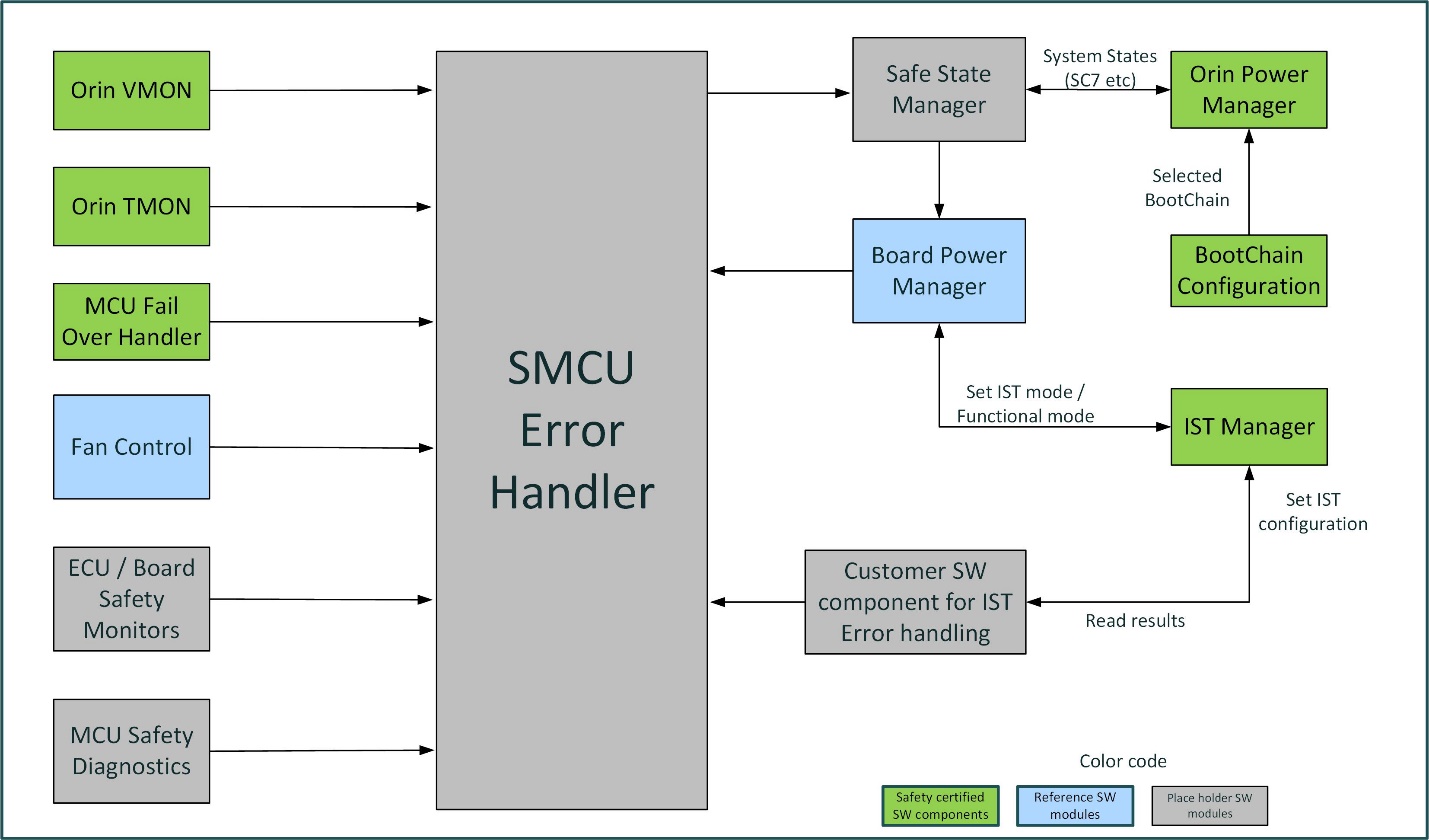 The green blocks shown in the pictures above are safety certified software components and the blue boxes are the software components provided as reference code. The gray boxes indicate placeholder software components used to evaluate the software architecture of NvMCU_SwModules. You must develop the complete functionality of reference software components and the placeholder software modules. The following topics describe the functionality provided by the NvMCU_SwModules and Reference software components.