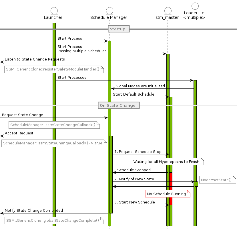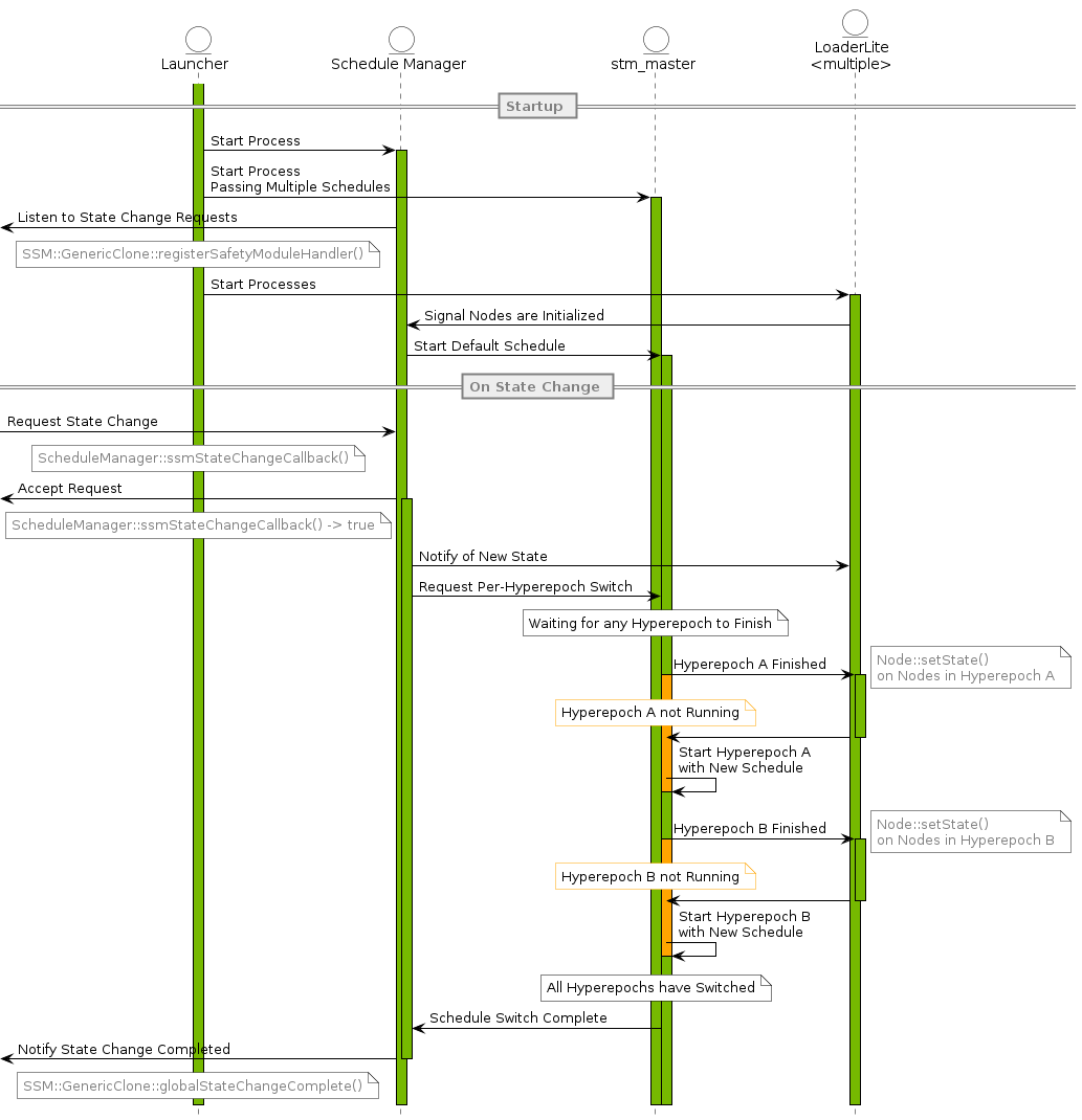 The request to change the state during runtime is coming from the System State Manager. If an application has more than one state, an additional process is being invoked by the launcher. The schedule manager process connects to SSM and waits for state change requests.