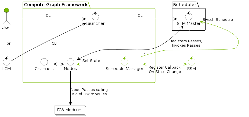 The following diagram illustrates the schedule manager and how it interacts with SSM as well as with the STM master and the nodes when SSM requests a state change.