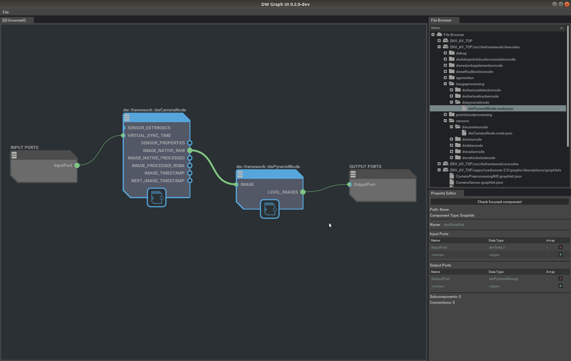 To create a graphlet with the nodes created, go to "Menu" and select "New Graphlet" or click the second icon on the toolbar. In the property editor window, names can be specified for the graphlet, graphlet input/output ports, and parameters. To add nodes or graphlets into this graphlet, drag and drop JSON files shown in the file browser window into the graphlet window. The new node and graphlet will show up in the graphlet window. The user can then create connections between nodes/graphlets in the GUI. Below is a screenshot of a new graphlet with dwCameraNode and dwPyramidNode nodes in dwnodes folder: