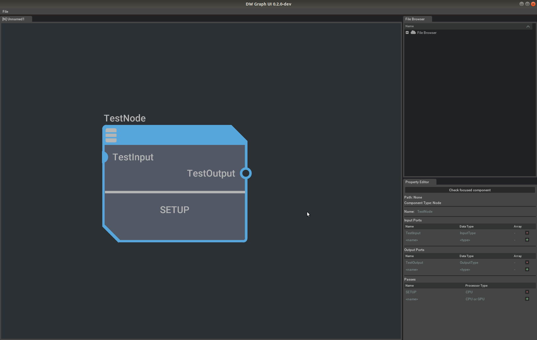 To add a node, go to "Menu" and select "New Node" or click the first icon on the toolbar. In the property editor window, names can be specified for the node, input/output ports, parameters and passes. The example below illustrates the creation of a node called "TestNode" with its input port called "TestInput" (data type: "InputType"), output port called "TestOutput" (data type: "OutputType"), and a pass called SETUP that uses the CPU as its resource: