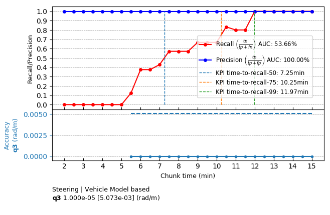 Several hours of data are used to produce a reference calibration value for cross-validation. Then, short periods of data are evaluated for whether they can recover the same values. For example, the graph below shows precision/recall curves of normalized steering offset q3 (q3=steering offset / wheelbase). Precision indicates that an accepted calibration is within a fixed precision threshold from the reference calibration, and recall indicates the ratio of accepted calibrations in the given amount of time.