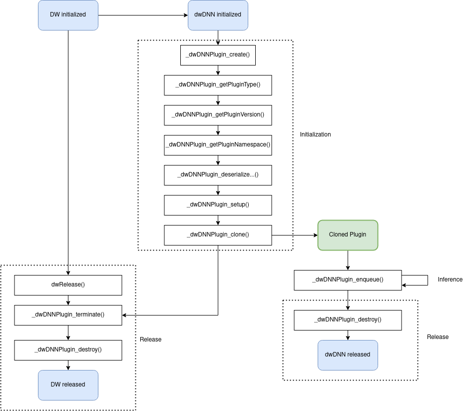 These functions have _dwDNNPluginHandle_t in common. This is a custom variable that can be constructed at initialization and used or modified during the lifetime of the plugin.