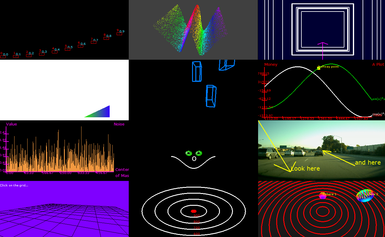 The sample creates a window and displays several tiled sections of the window with different rendered primitives.
