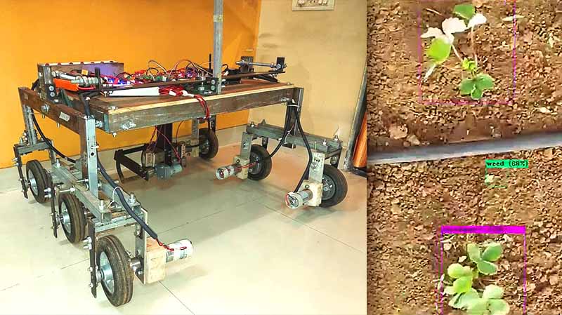This autonmous robot is powered by 6 planetary geared motors and its design is based on the Rocker-Bogie mechanism employed by NASA/JPS for interplanetary rovers. Controlled by a Jetson Nano 2GB, this robot uses 2 camera sensors (front and back) for navigation and weeding. Autonomous navigation through crop lanes is achieved using a probabilistic Hough transform on OpenCV and crop and weed detection is powered by tiny-YOLOv4.