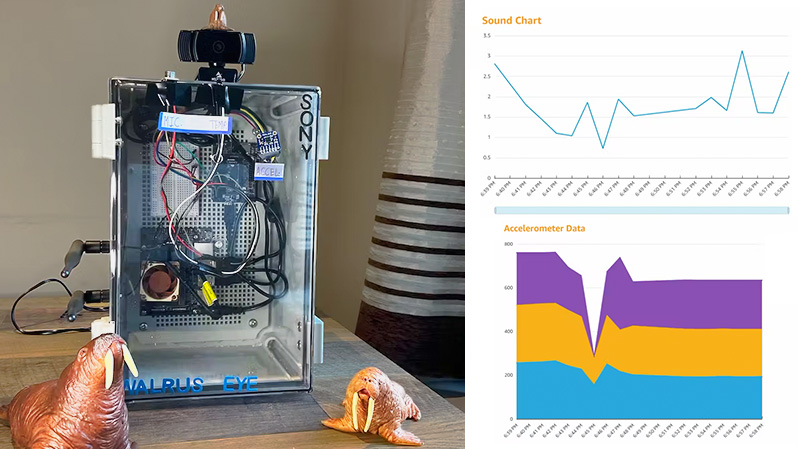 Walrus populations faces challenges from human environmental intervention such as climate change. Currently, biologists monitor their populations to gauge these effects on their species by hand-counting using drone photos of locations where walruses collect on the shore. Inspired by a National Geographic article, WalrusEye runs a custom-trained YOLOv4 model on Jetson Nano to power an up-to-the-minute population dashboard. Temperature, sound and acceleration sensors provide live weather conditions, signs of potential walrus stampedes. GNSS sensors allow scientists to deploy multiple WalrusEyes in different locations. AWS Dataset and AWS QuickSight allow the live data from WalrusEye to appear in the dashboard.