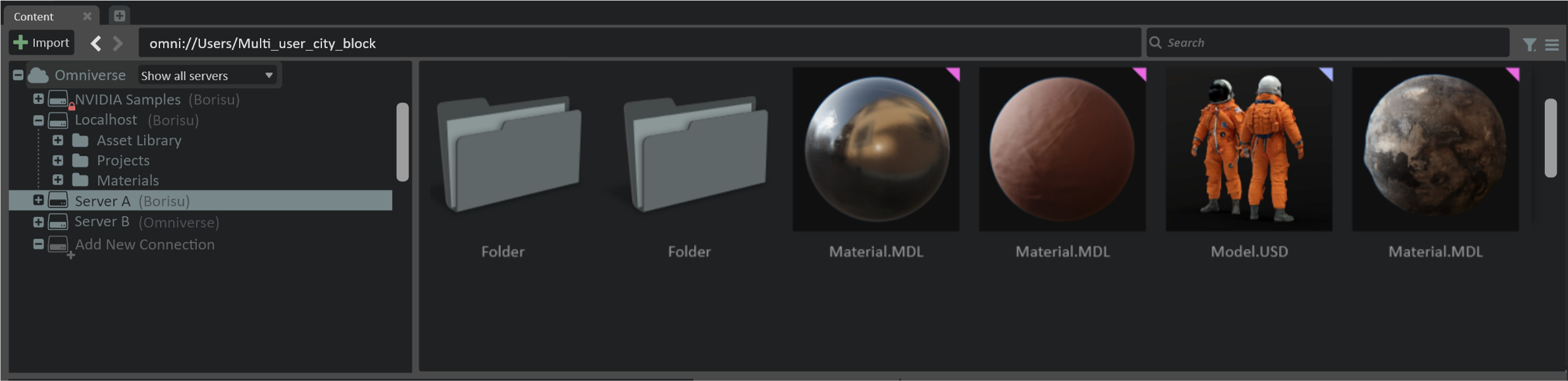Busca archivos en tus servidores de Omniverse Nucleus locales o remotos, organiza tus datos y encuentra el archivo en el que deseas trabajar o colaborar. Incluye un amplio conjunto de API que te permiten automatizar tareas y procesos. Por ejemplo, puedes usar DeepTag para usar la IA en la asignación de clasificaciones de metadatos, lo que permite formas completamente nuevas de realizar búsquedas en tus recursos.