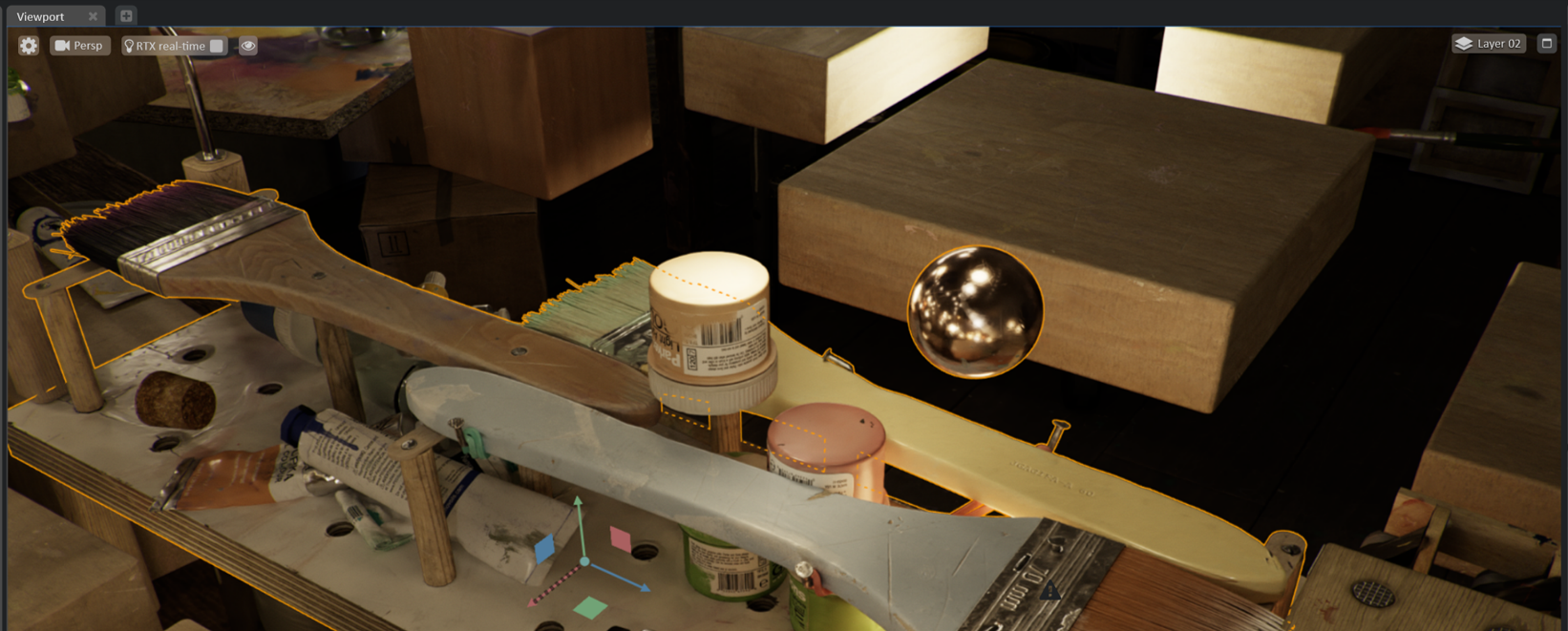 Finalmente, la ventana de capas te brinda acceso al poderoso sistema de capas proporcionado por USD que permite una composición rica. Esto también se aprovecha para proporcionar las funciones de Omniverse relacionadas con la administración de acceso a capas y la colaboración en vivo.