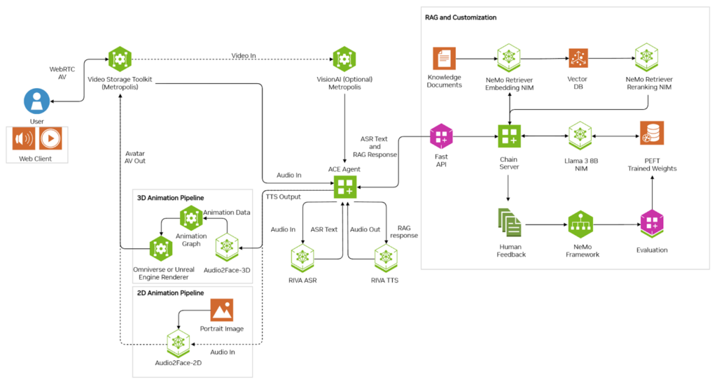 NVIDIA NIM と Blueprints を用いた対話型アプリケーションは、複数の NIM が連携して動作します。音声入力から会話生成、音声出力までを一連のフローとして統合することで、リアルタイムな応答を実現しています。