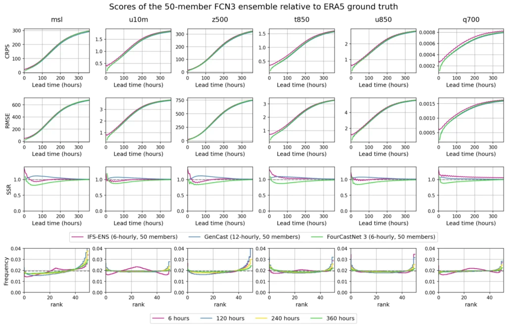 FCN3 の確率的アンサンブルは、一貫して 1 に近いスプレッド スキル比を示しており、予測された不確実性が実際の大気変動と密接に一致する、十分にキャリブレーションされた予報であることを示しています。ランク ヒストグラムおよびその他の診断結果から、アンサンブル メンバーが実際の観測値と同等に扱えることが確認されており、FCN3 の予測が信頼性と妥当性を兼ね備えていることが裏付けられています。