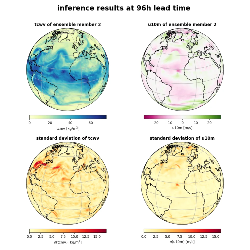 FCN3 推論は、Earth2Studio で簡単に実行できます。単一の 4 メンバー アンサンブル推論を実行するなら、次のコードを実行できます。