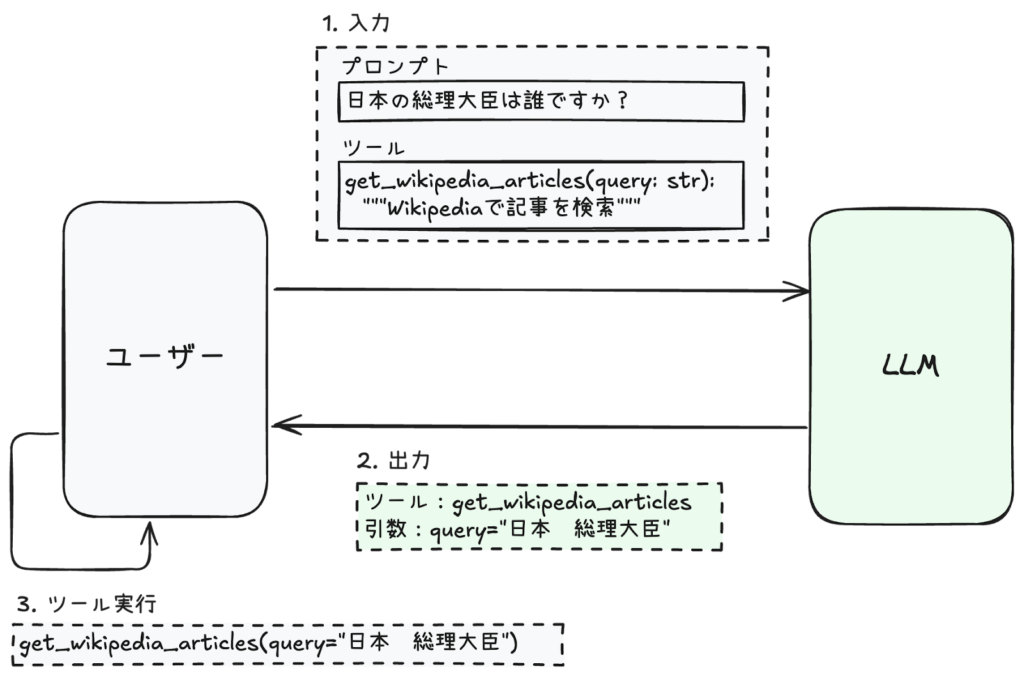 まずはユーザーからの入力ですが、プロンプトとツールがあります。ユーザーは日本の総理大臣の名前を聞いています。また、ツールとして Wikipedia 検索 (get_wikipedia_articles 関数) を指定したとします。続いて LLM は、「get_wikipedia_articles を query=”日本 総理大臣” で使いますよ」と返答します。(分かりやすさのために LLM の思考過程をあえて書き出すと、LLM は「ユーザーは日本の総理大臣を知りたいらしい。でも現在の総理大臣が誰かは確証を得られない。ツールとして Wikipedia 検索があるようだ。それならまずは ”日本 総理大臣” で Wikipedia 検索をしよう」というような考えから上記の出力をしたと捉えると Tool Calling がより分かりやすいです。ただし、この思考過程は LLM が実際に行っているものではなく、わかりやすさのために筆者があえて書いていることにご留意ください。) そして、ユーザー側では LLM の出力に従って、get_wikipedia_articles(query=”日本 総理大臣”) を実行します。あとは Wikipedia の検索結果をプロンプトに追加して再度 LLM に入力文を送ることで、最終的な回答を得ることができます。