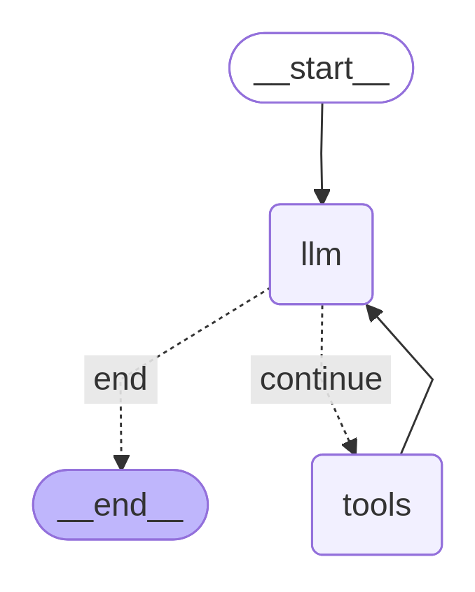 いまから実装する ReAct エージェントをグラフで実装します。視覚的には以下の図にあるようなグラフになります。__start__ ノードから開始し、llm ノードが条件分岐しています。LLM がツールを使う場合 (continue エッジ) は tools ノードに行きツールを実行したら、また llm ノードに戻ります。一方で、LLM がツールを使わない場合 (end エッジ) は __end__ ノードで終了します。