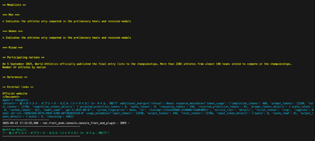 nat run --config_file configs/openai_config.yml --input "2025年に東京で行われた世界陸上 男子100mの金メダリストは誰?そのタイムは? Think and search in English, answer in Japanese"