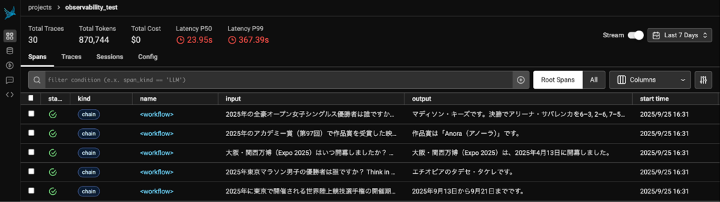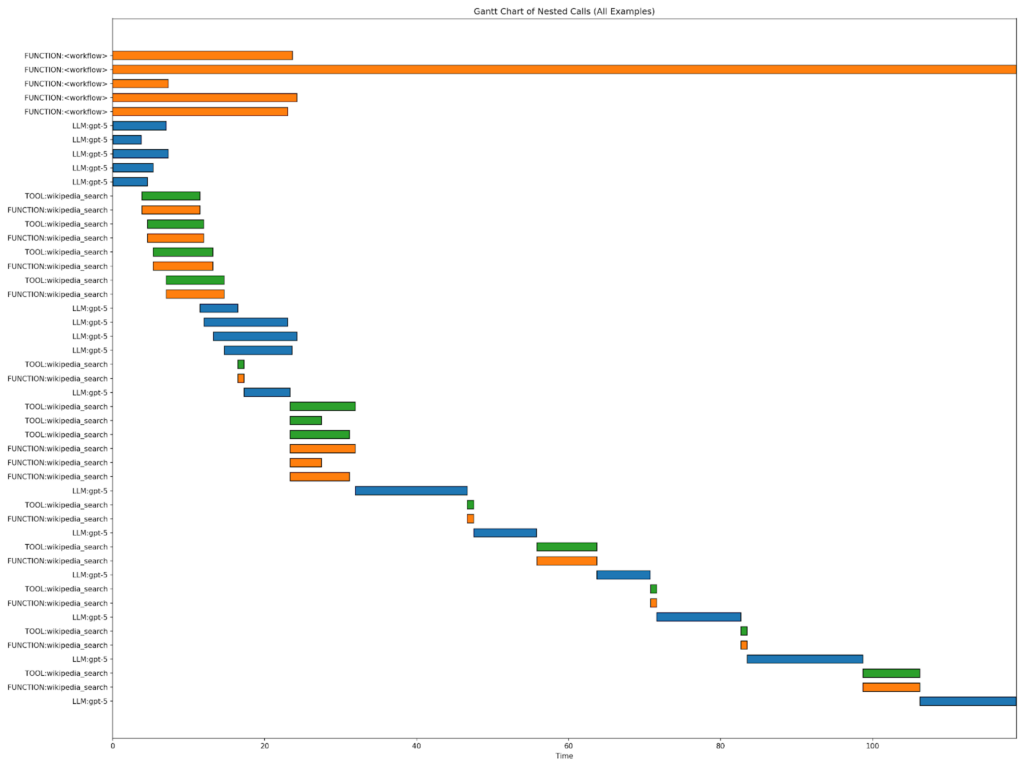 ガント チャートを見ると緑色 (もしくはオレンジ色) で示した wiki_search の実行時間と青色で示した LLM の実行時間は同じくらい、もしくは LLM の方に時間がかかっていることがわかります。このモデルはリーズニングを行うモデルのため、特定の質問 (2 つ目) でリーズニングを繰り返し、実行時間が長くなっていることがわかります。