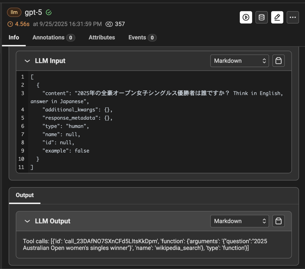 質問を受け取って、wikipedia_search ツールを選択していることが確認できます。