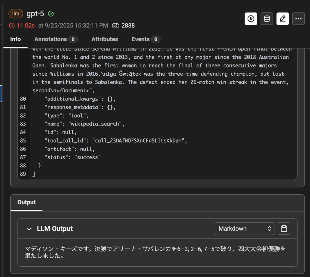 Wikipedia の検索結果を元に正しく回答できていることが確認できました。