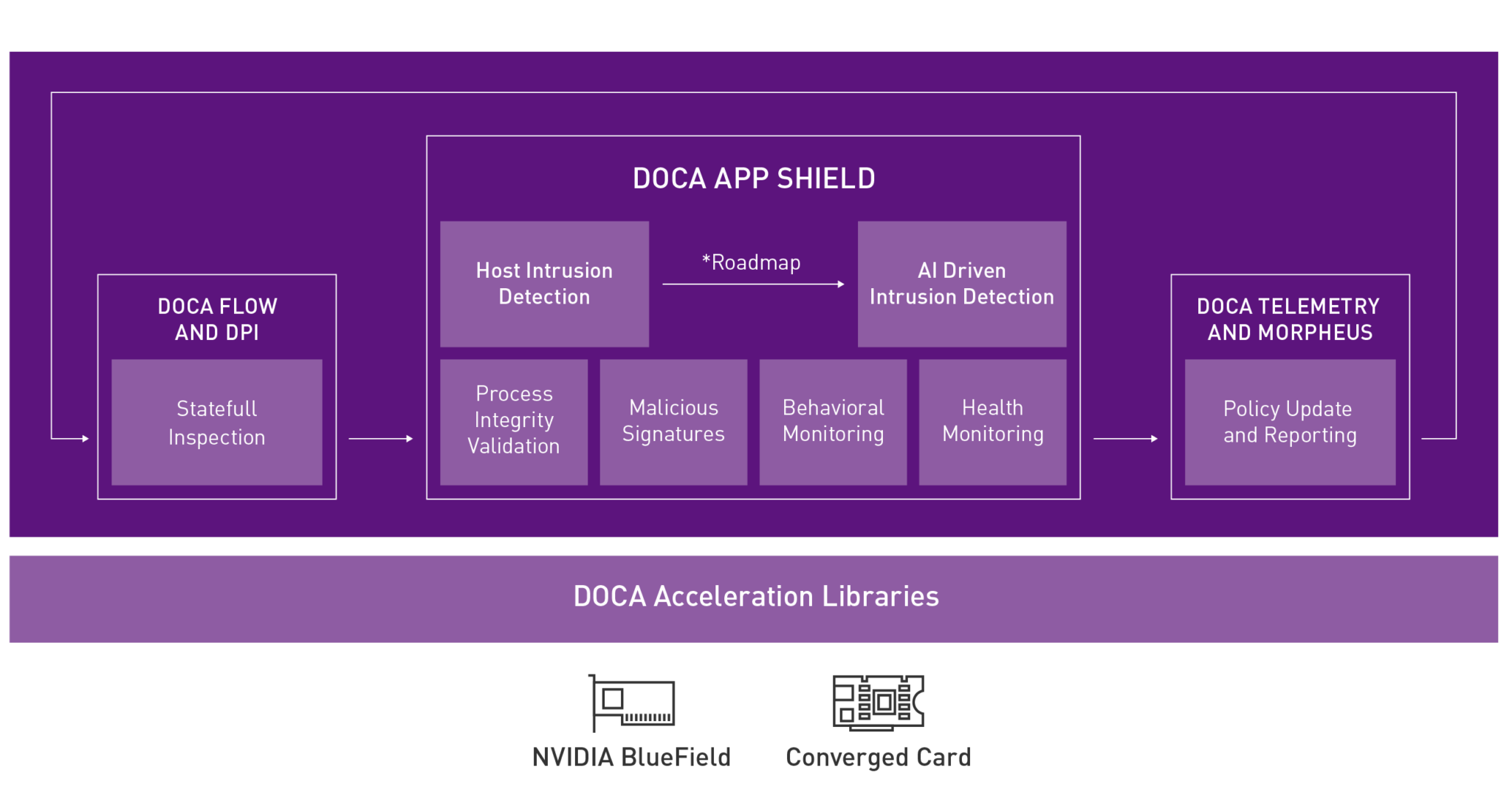 DOCA 앱 쉴드의 호스트 모니터링 기능은 사이버 보안 벤더가 가속 침입 탐지 시스템(IDS) 솔루션을 구축해 어떤 물리 또는 가상 머신에서 공격도 식별하게 해줍니다. 애플리케이션 상태 관련 데이터를 보안 정보와 사고 관리(SIEM) 또는 확장된 탐지와 대응(XDR) 툴에 제공하고, 포렌식(forensic) 조사 또한 개선합니다.